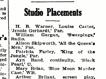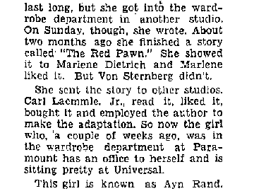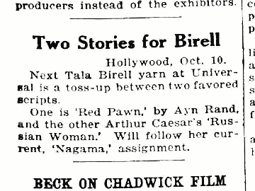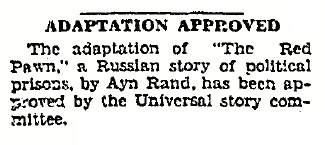 | Ayn Rand’s first professional sale was her story “Red Pawn” to Universal in 1932. The Los Angeles Times reported it. There’s an error here. [In the video counterpart of this web page, animation strikes out “Paramount,” and writes over it “RKO.”] image: Los Angeles Times, September 30, 1932, pg. A4 |