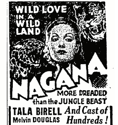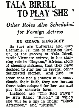 That release was still in the future when the family who owned and ran Universal planned for their star Tala Birell to headline more films—including “Red Pawn”—after the one she was doing then: Nagana. image: (left) Los Angeles Times, October 20, 1932, pg. A9 |