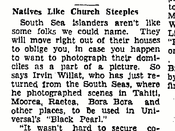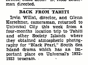 | Only two months after buying “Red Pawn,” Universal put Ayn Rand to work, likely without creative input, on a screenplay called “Black Pearl,” for which background film had already been shot in Tahiti, Bora Bora, and elsewhere in the South Seas. Where Variety says Ayn Rand was assigned to “continuity,” industry people understood it meant she would perform detail-oriented tasks such as assuring the script was properly formatted to prevent scheduling foul-ups, and prevent errors of detail from being filmed. “Black Pearl” was never made, but its story may not end there. [The following comments accompany film footage in the video:] images: Variety, November 29, 1932, pg. 12; Notes: see the appendices page for more about what “continuity” meant in the movie industry circa 1932.