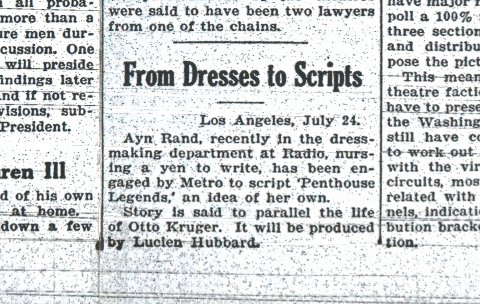 | Paramount put Ayn Rand on salary to write, but unlike Universal, did not keep her around to shape another screenplay once the “Red Pawn” assignment was finished. (Once again, Miss Rand’s name was misspelled, with “e” in “Ayne.”) image: Variety, July 28, 1934, pg. 3 Notes: Readers wanting to know more about “Red Pawn” should keep in mind that Ayn Rand first wrote it as a story synopsis, which she then expanded into a screenplay. The synopsis, running fifty-eight or seventy-four pages in print (depending on type size of the edition), is published in The Early Ayn Rand: a Selection from Her Unpublished Fiction, edited by Leonard Peikoff (New American Library, 1984; revised edition (adding one story), 2005). The screenplay itself remains unpublished. Paramount continues to own the right to produce a movie from the screenplay. |