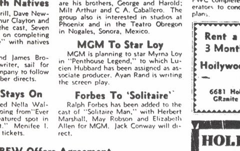 | Rising MGM star Myrna Loy was planned to be the headliner of “Penthouse Legend.” Ayn Rand wasn’t yet known, hence the typo. [In the video, after time to allow viewers to notice “Ayan Rand,” an “X” appears over the lowercase “a” in “Ayan.”] image: Hollywood Reporter, August 4, 1933, pg. 4 |