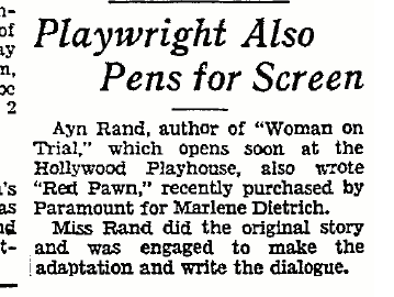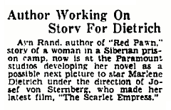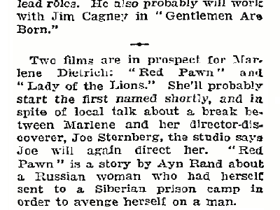 | “Red Pawn” was poised for production again in the summer of 1934. As reported here, “Red Pawn” was one of two prospective films for Marlene Dietrich. This newspaper item from the Hartford Courant—of Hartford, Connecticut, no less—reported Ayn Rand’s name as writer. Paramount was Ayn Rand’s employer this time, Paramount being Marlene Dietrich’s studio and the new owner of the “Red Pawn” property after Universal traded it while phasing out Tala Birell films. images: (top) Chicago Tribune, June 27, 1934, pg. 16; |