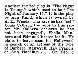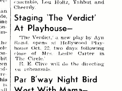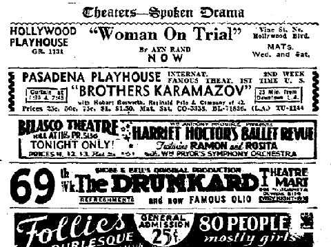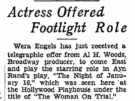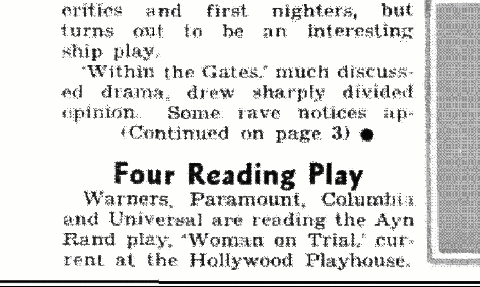 | The first professional performance of an Ayn Rand work occurred when Ayn Rand’s play “Woman on Trial” was presented on stage in a Hollywood live theater. image: Los Angeles Times, October 18, 1934, pg. 19 |