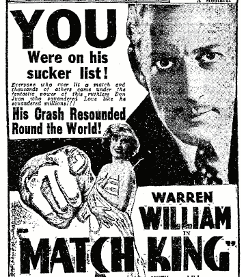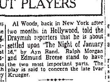 The suicide of Kreuger had been dramatized previously in a movie titled The Match King, which Warner Bros. rushed to the screen before 1932 was out. Its story is much different from that of Ayn Rand’s play. | ||||