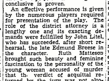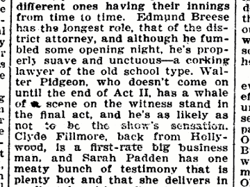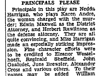 | When the Boston Globe reviewed the opening performance, the report stated that Edmund Breese had died and that his replacement, after “short rehearsal,” had succeeded in what the newspaper recognized was a “lengthy” role with “exacting demands.” That replacement was John Litel, and we can gauge his ability to play a district attorney by seeing his performance as an attorney three years later. image: Boston Globe, April 13, 1936, pg. 9 |