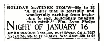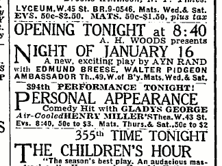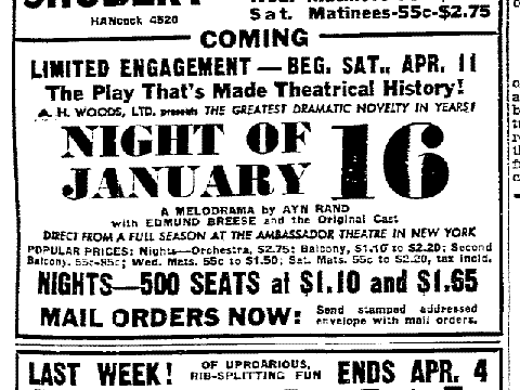 | “Night of January 16” was still on Broadway six months after its premiere. This ad appeared five months after the premiere. image: The New York Times, February 11, 1936, pg. 19 |