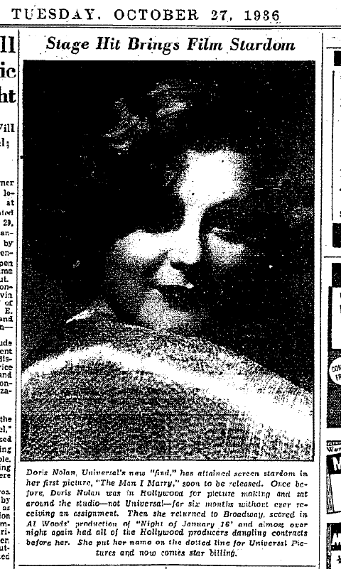 | After well-known actresses were sought for the leading lady role, it went to an actress who had failed in Hollywood and now had returned to New York. She was Doris Nolan, and her stint in “The Night of January 16” brought her roles as leading lady in major-studio films beginning soon after “Night of January 16” ended its successful run. image: Washington Post, October 27, 1936, pg. X13 |