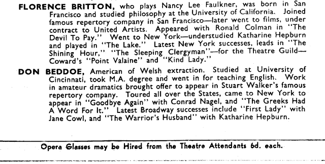 | You are seeing the cast list of the original London production, which opened September 1936. The name Don Beddoe turns up as consistently working on Broadway 1929 to 1935, and he began a Hollywood career in 1938 playing small roles for the next several decades. The Don Beddoe of Broadway and Hollywood was also the Don Beddoe who acted in England 1936-1937. The program for the London production of “Night of January 16”—which you see here—reports that he was American and had been appearing on Broadway. Beddoe never returned to England to work; four major British newspapers don’t report any Don Beddoe acting there the dozen years before 1936 nor the dozen years after 1937. image: (right) The Times (London), September 30, 1936, pg. 10 |