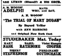 | Web Bonus Content | Had Ann Harding played in Night of January 16th, she would have done so having already starred in the play which inspired Ayn Rand to devise her first theatrical drama. As demonstrated by the ad at right, Ann Harding had been in The Trial of Mary Dugan in New York and was starring in it in Chicago in 1928 (the ad is within a strip under the heading “When in Chicago Visit These Hits”); Al Woods had produced that play, too. Ayn Rand saw a production of that play in California during the early 1930s, while working on We the Living, and would not have the plot point of the industrialist’s assumed suicide until Ivar Krueger’s death in 1932. image: Weekly Variety, October 10, 1928, pg. 59 | ![]() | |||
