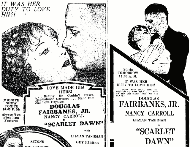 At the end of 1932, Warner Bros. would release its own film about people caught up in the turmoil of the Soviet take-over: Scarlet Dawn. Images: all three are from newspaper ads in 1932. The image below is a detail area of the center image. |