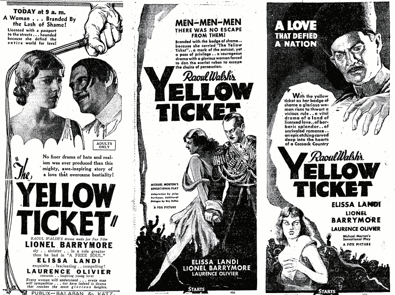 Neither newspaper story mentions it, but Fox Film the prior year made a film about an innocent woman’s abuse by Russian officials and Russian policy, The Yellow Ticket. images: (left) detail from an advertisement for Fox’s The YellowTicket movie, published in the Los Angeles Times, October 23, 1931; |