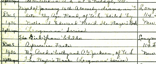 | Here are some facts: • The first two copyright registrations for the play under either of these titles were for the “Director’s Manuscript” and “players book” editions, which were both registered December 5, 1936. (Prior to this, the work was protected by copyright through Ayn Rand registering it as “Penthouse Legend” in 1933, and through common-law copyright accorded works which had not been published, even if performed before audiences.) Both copyrights declare the title as “Night of January 16th” and that the work is “a comedy-drama in 3 acts, by Ayn Rand, edited by Nathaniel Edward Reeid.” |