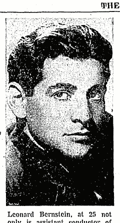 | In March 1944, Bernstein had made himself a national reputation as the 25-year-old assistant conductor who on a moment’s notice and without rehearsal conducted a symphony program on a radio broadcast when the planned conductor took sick. images: Baltimore Sun, March 12, 1944, pg. A10 |