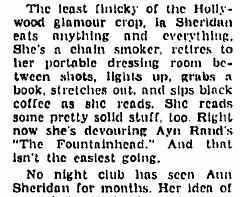 | In July 1944, syndicated Hollywood correspondent Hedda Hopper interviewed Ann Sheridan and reported that Sheridan was “devouring” The Fountainhead. Ann Sheridan was contracted with Warner Bros.—so she may have been reading to see herself as heroine Dominique. image: Interview of Ann Sheridan by Hedda Hopper, Hartford Courant, July 9, 1944, pg. SM8; this article also appeared the same day in the Baltimore Sun (pg. SM4) and the Chicago Tribune (pg. C3). |