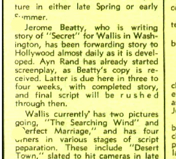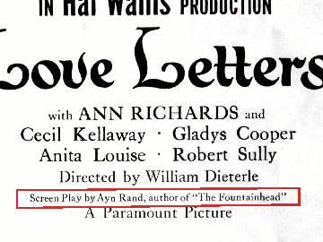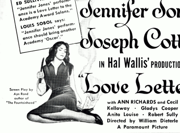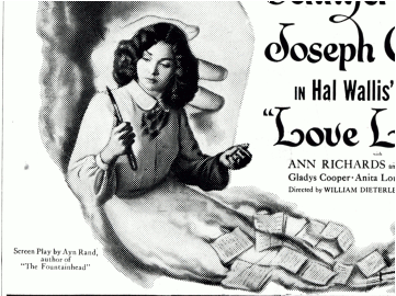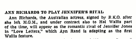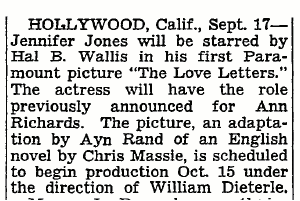 | Two months later, it was reported that Ayn Rand was adapting Love Letters for Wallis. Unlike the “Lola Montez” project, Love Letters made it to film. What viewers of the film might not have known was that Ann Richards was originally to play the lead role eventually played by Jennifer Jones. image: The New York Times, September 18, 1944, pg. 16 |