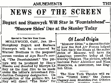 | At Warner Bros., casting was announced for The Fountainhead: Humphrey Bogart and Barbara Stanwyck. image: The New York Times, January 20, 1945, pg. 16 |