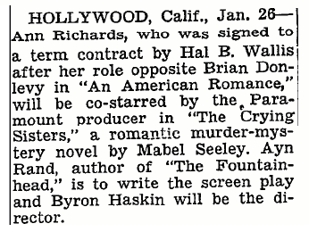 | Another assignment from Hal Wallis to Ayn Rand was adapting a novel titled “The Crying Sisters.” Ann Richards was again to star. images: (right) The New York Times, January 27, 1945, pg. 15; |