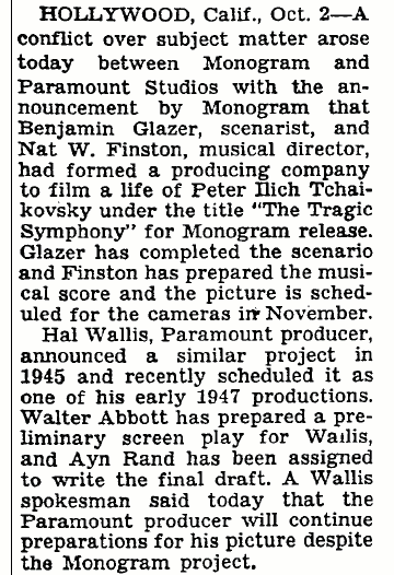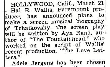 | Ayn Rand was assigned to dramatize the life of Peter Tchaikovsky. As reported in this March 22, 1945, item:— image: (right) The New York Times, March 22, 1945, pg. 19 |