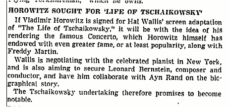| A month later, it could be reported that Wallis’s Tchaikovsky film might be made with the cooperation of Vladimir Horowitz and Leonard Bernstein. images: (below) Los Angeles Times, April 27, 1945, pg. A3; |