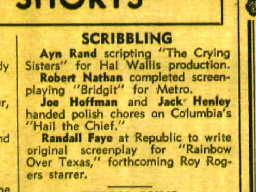 | —Ayn Rand! This announcement appeared in Variety, December 3, 1945. image: Variety, December 3, 1945, pg. 11 |