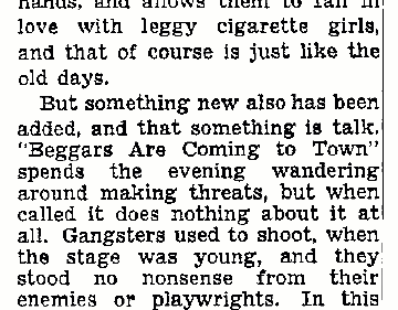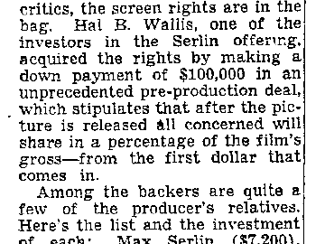 Come October, several newspapers had fun reporting that Hal Wallis had bought screen rights to the play “Beggars Are Coming to Town” several weeks before its opening. Less fun was had by audiences inside the theater, condemning the play to a run of twenty-five performances. For this Wallis paid $100,000 and guaranteed percentages of the profits to the play’s backers. |
