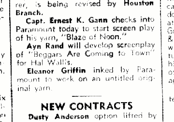 | 1943 was a great year for Ayn Rand. May 7th was publication date for her novel The Fountainhead. Before the year was out, she sold the Fountainhead movie rights to Warner Bros. and moved back to California for that movie. Warner Bros. had not been the only studio interested. They aren’t even named in this Variety item from just one month and two days after The Fountainhead was published, but image: Variety, June 9, 1943, pg. 6 |