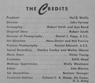 June 1945 marked the first time that the name of Ayn Rand appeared onscreen and in ads as a screenwriter. She and writer Robert Smith shared credit for the screenplay based on Smith’s story. Rand said privately that the movie also reflected the influences of the director and the producer.
