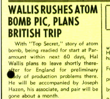| In January 1946, five months after the bombings of Hiroshima and Nagasaki brought the world into the atomic age, Hal Wallis was rushing to make a film on the development of the atomic bomb. Its title: “Top Secret.” Ayn Rand was assigned to write, working from material supplied by a contact in the nation’s capitol. images: two sections of an article in Daily Variety, January 14, 1946, pg 11 Note: Groves’s participation in the two productions was reported as follows: “It was very hush-hush, but Maj. Gen. Leslie R. Groves, who was in charge of the atomic bomb project, spent a day on the Metro [ |