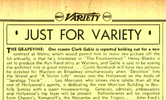 | Gable when renegotiating his MGM contract the year prior to that interview was reported to be attempting new terms allowing him to do The Fountainhead at Warner Bros. while also working at MGM most of each year. image: Daily Variety April 16, 1946 |