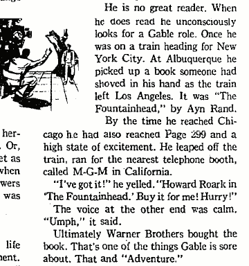 | The Fountainhead was delayed. In a January 26, 1947, interview, Clark Gable stated that he read The Fountainhead in 1943 and immediately wanted to play Roark. Unfortunately, his studio— image: Interview of Clark Gable by Eleanor Harris, Los Angeles Times, January 26, 1947, pg. E6; this interview also appeared the same day in Baltimore Sun, pg. WM6, and in New York Herald Tribune. |