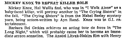 | Two years and four months after the first stories about Hal Wallis planning “The Crying Sisters,” this story appeared about actor Mickey Knox being considered for it. image: Los Angeles Times, May 28, 1947, pg. A7 |