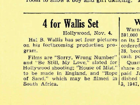 | The last of the Hal Wallis projects we’ll discuss—potential or made—is “House of Mist.” It would have a fairy-tale atmosphere to tell a story of romance, suitable to be enjoyed by adults, and plans were considered to film in England. British performers may well have made up most or all of the cast had the film been made. image: Weekly Variety November 5, 1947, pg. 7 |