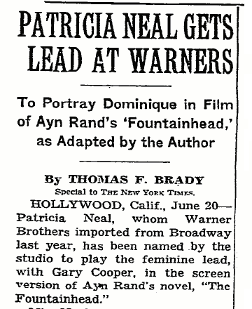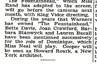 | On March 29, 1948, news was reported which should have been decided long before: The Fountainhead would star Gary Cooper. This item mentions Lauren Bacall as a possible Dominique. She was a major Warner Bros. star, and had a tough demeanor. Had Roark not been recast, she would be repeating already-established screen chemistry. Before 1948 was over, she had starred four times opposite Humphrey Bogart, for three years now her off-screen husband. image: The New York Times, March 29, 1948, pg. 18 |