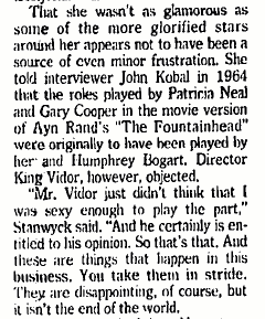 | Barbara Stanwyck discussed her removal from the Fountainhead cast sixteen years afterward, and an obituary carried her explanation that director King Vidor rejected her. Stanwyck’s portrayal of Dominique would have reunited her with Gary Cooper after two 1941 films. image: Washington Post, January 22, 1990, pg. B1 |