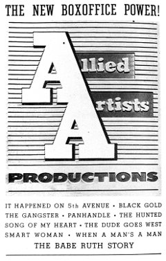 | However, Monogram had recently resolved to make better films, and chose the studio name Allied Artists on these films so that the name Monogram would not appear on advertising. This trade ad lists Song of My Heart, the eventual title of the Allied Artists Tchaikovsky film. image: Motion Picture Almanac, 1948-49, pg. 257 |