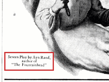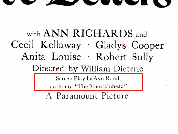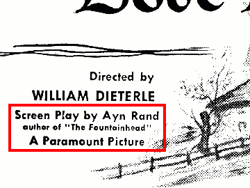 | Warner Bros. was good for Ayn Rand; there, she met a producer about to leave Warner Bros. and who thus soon hired her to write screenplays for him at his new independent production company aligned with Paramount. | ![]() |