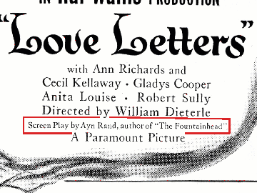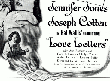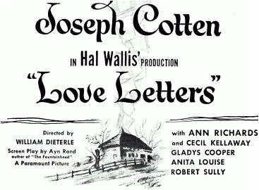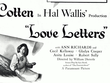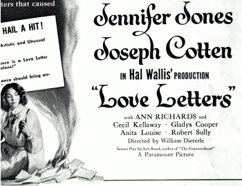 | Two months after You Came Along was released, Love Letters reached theaters, and for the first time Ayn Rand’s name appeared as sole screenwriter. Love Letters had completed filming two months prior to You Came Along doing so, but was held back while the more topical You Came Along was rushed to screen a month after Germany surrendered in WWII. As you see here, Paramount’s advertising materials for Love Letters touted—in conjunction with their screenwriter’s name—that she was the author of The Fountainhead, stating that fact under her name. Although the book had been published two and a quarter years earlier, in 1945 The Fountainhead appeared on more bestseller lists than it had the prior two years. images: ads for Love Letters in Paramount’s press book for the movie. |