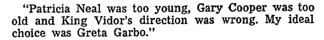 | Eleanor Parker had impressed people with her performance in the Bette Davis role in the 1946 remake of Of Human Bondage, and went on to more lead roles. A biography of Gary Cooper reports that Parker was considered to play Dominique. image: (right) from “Gary Cooper: American Hero,” by Jeffrey Meyers (1998), pg. 216 |