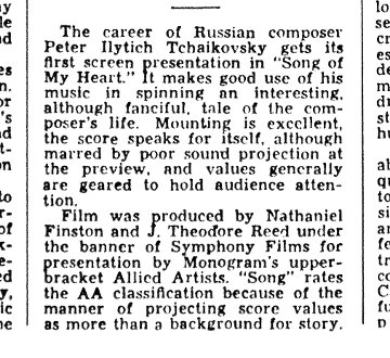 | Variety let its readers know that Allied Artists was Monogram in its review of this fictionalized biography of Tchaikovsky, shown to the film trade in late 1947 and released to the public the next year. Produced at a cost of $600,000, it was twice as expensive as a major-studio low-budget film and six times as costly as a standard Monogram picture. images: review of Song of My Heart, in Weekly Variety, November 5, 1947, referring to “Monogram’s upper-bracket Allied Artists”; |