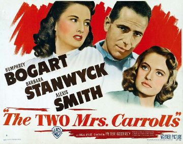 Stanwyck had also been announced to play The Fountainhead opposite Humprey Bogart. How they would play opposite each other was also captured on film, this time in The Two Mrs. Carrolls. This was not a coincidence. When The Fountainhead couldn’t go before the cameras in early 1945 owing to a war-related shortage of building materials necessary for sets, Warner Bros. shifted their two lead Fountainhead actors to The Two Mrs. Carrolls. images: still photograph and poster of Humphrey Bogart and Barbara Stanwyck in The Two Mrs. Carrolls; Note: Alexis Smith—the other star named on the poster—is discussed later. |