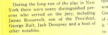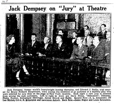 | A story appearing a few days after opening night reported that sitting on the jury was Jack Dempsey, former heavyweight boxing champion of the world. image: Boston Globe, September 20, 1935 Note: The identification in the newspaper caption for Edward J. Reilly being counsel for Bruno Hauptmann, was written for 1935 readers, who would instantly identify Hauptmann as the infamous defendant in the trial of the kidnapping and murder of the baby of Charles Lindbergh, the celebrated pilot who in 1927 was the first to fly solo across the Atlantic. Daily Variety, September 17, 1935, pg. 1, places these jurors on the jury of the opening night performance, by identifying the following as having been among the twelve on September 16: “Col. Fitpatrick of Madison Square Garden; Edward J. O’Reilly, Bruno Hauptman[n]’s chief counsel in Lindbergh kidnaping trial; Jack Dempsey, Dr. Leo Michel and Jimmy Stroock.” |