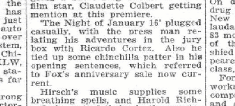 | While we’re talking about celebrities who emerged from acting roles in “Night of January 16th,” it’s worth talking about celebrities who served as jurors on stage in “Night of January 16th.” Ayn Rand in her introduction to the play said that the producer of the Broadway production “was besieged by requests from celebrities and others who wanted to sit on that jury.” film source: Midnight Lady (1932) |