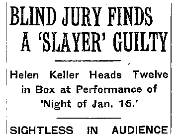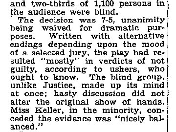 A New York Times story about that performance reported that Helen Keller herself voted for the defendant’s acquittal, but was out-voted by the other jurors. Keller said that the evidence was “nicely balanced.” images: two sections of a story in The New York Times, December 16, 1935, pg. 22 |
