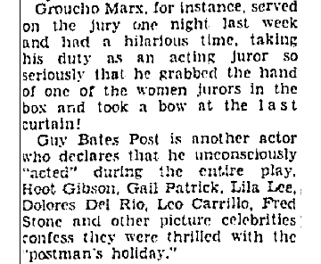 | The Los Angeles Times reported that actor Guy Bates Post admitted that throughout the play he unconsciously acted, presumably causing his face and body to take on an outward appearance suitable for the role of juror. images: Los Angeles Times, March 15, 1936, pg. C1; |