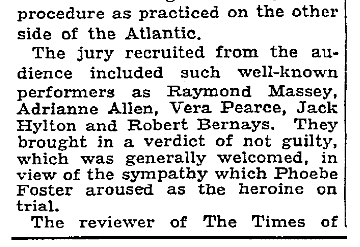 | In late 1936, the London production on opening night had on its jury already-established star actor Raymond Massey. Twelve years later, Raymond Massey would be in America on a Warner Bros. sound stage playing the role of Gail Wynand in The Fountainhead. image: The New York Times, September 30, 1936, pg. 29 |