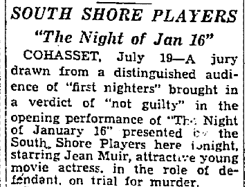 | A local production outside Boston in 1937 which drew as its female lead a sometimes movie actress and which boasted a member of the Broadway cast, also had among its South Shore Players— images: two sections of a story in the Boston Globe, July 20, 1937, pg. 17 |