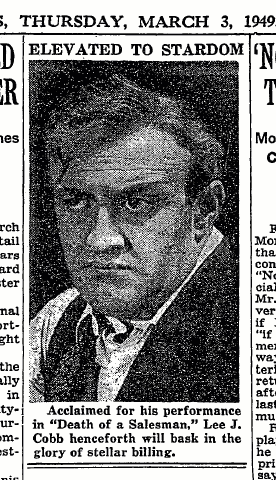 | Lee J. Cobb would star in the original Broadway production of “Death of a Salesman” and in the 1957 movie of Twelve Angry Men played the bigot juror—the angriest of the twelve. His talent was recognized by Broadway casting directors way back in 1935 and 1936, so he often went from show to show. Early in a six-month break in Broadway work, he played the private investigator who shadowed Bjorn Faulkner in the aforementioned 1936 Massachusetts production of “Night of January 16th.” image: The New York Times, March 3, 1949, pg. 32 |