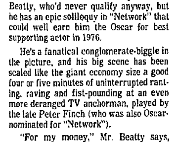 | Late in life, Ayn Rand considered for the role of James Taggart—a villain in Atlas Shrugged—Ned Beatty, who won an Academy Award for playing a megalomaniac corporate head in Network. image: Baltimore Sun, March 1, 1977, pg. B5 |