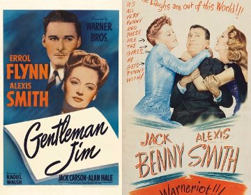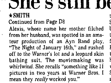 | Alexis Smith was leading lady to the major leading men at Warner Bros. throughout the 1940s, but that followed from her being spotted by a talent scout who saw her in her college’s student production of “Night of January 16th.” image: Boston Globe, September 30, 1979, pgs. D1,8,9 |