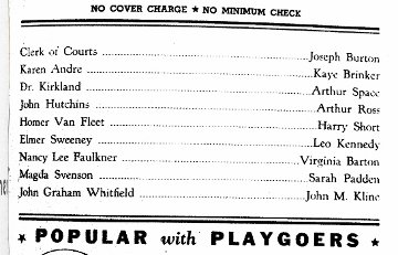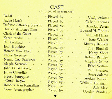 | Arthur Space was a busy actor in Hollywood during the 1940s and 1950s, bringing his dignified manner to roles as bankers, sheriffs, coroners, medical doctors, inventors, often in Westerns. He got early experience in such roles in 1936 by playing the medical examiner in productions of “Night of January 16” in Chicago and Pittsburgh. image: cast list with Arthur Space listed in program for engagement of “Night of January 16” in Pittsburgh, November 1936; Sarah Padden was repeating her role from the Broadway run. Note: The program for the Pittsburgh engagement indicates that it was presented by A. H. Woods, Ltd. The engagement is being brought up with the revivals inasmuch as the only aspect under discussion here are cast members brought in late in Woods’s connection to the play. |